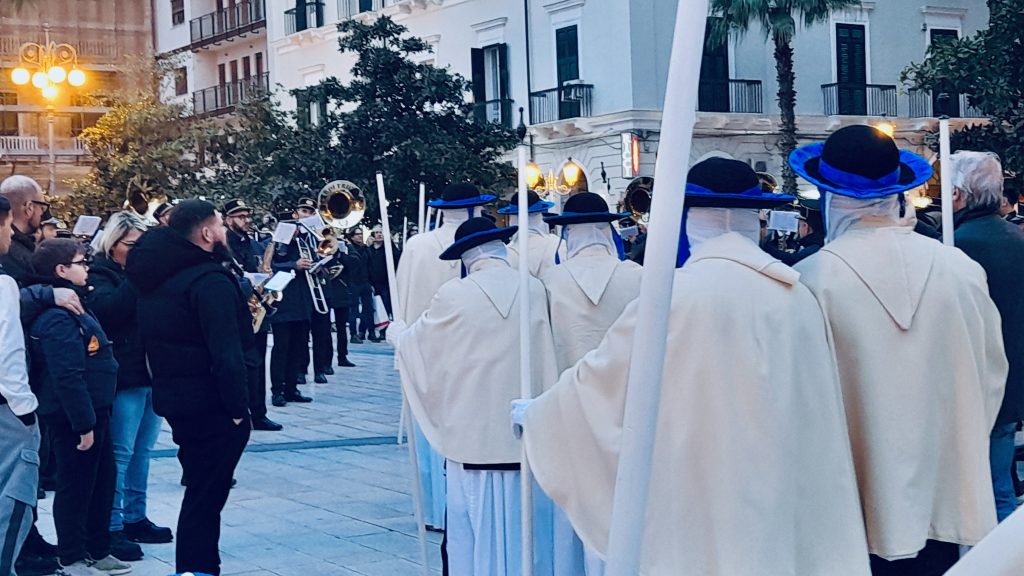 Altre coppie di confratelli hanno compiuto, invece, un giro perimetrale intorno alla stessa chiesa del Carmine. Decine le coppie di “perdoni” a “nazzicarsi” (la popolare andatura con movimenti lenti dei fianchi) per le strade della città. Fra questi, molti giovani, qualcuno alla prima esperienza.